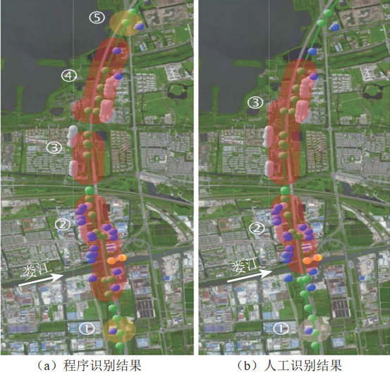 從對比情況來(lái)看,程序共識別出Ⅲ級高后果區3處、I級高后果區2處,人工識別出Ⅲ級高后果區2處、Ⅱ級高后果區1處,主要區別如下:圖 6(a)中高后果區①和(b)中高后果區①范圍基本相同,涵蓋大公小學(xué)(特定場(chǎng)所I),但高后果區等級不同,分別為I和Ⅱ級,主要原因是西氣東輸作業(yè)指導書(shū)中對人口密度與建筑物密度換算有更高的要求[16];圖 6(a)高后果區②為圖5中Ⅲ級、Ⅱ級和I級高后果區合并得到的,而(b)中高后果區②未覆蓋到婁江以南的I級高后果區,可能是由于人工劃分失誤導致;(a)中③和④不符合合并條件,但在人工劃分中將兩者合并,人為擴大了Ⅲ級高后果區范圍;(a)中④北部區域將兩處特定場(chǎng)所I一并納入,而(b)中③可能由于人為劃分失誤未予以統計。程序劃分相比人為劃分可在一定程度上減少人為劃分失誤因素,為精準快速的高后果區劃分提供參考。