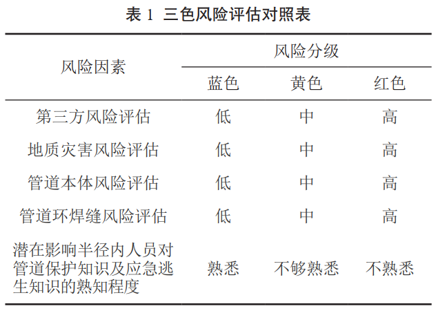 一是對高后果區管段內的第三方風(fēng)險、地質(zhì)災害風(fēng)險、管道本體風(fēng)險、管道環(huán)焊縫風(fēng)險,按照低、中、高依次對應“藍、黃、紅”。藍色風(fēng)險重點(diǎn)巡護,黃色風(fēng)險上報計劃維修,紅色風(fēng)險立即治理(表 1)。