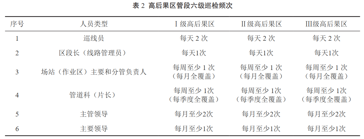 巡護質(zhì)量達標。高后果區管段實(shí)行六級巡護制度。分為巡線(xiàn)工、區段長(cháng)(線(xiàn)路管理員)、作業(yè)區、管道科、主管領(lǐng)導、主要領(lǐng)導六個(gè)層級,分別按照不同要求開(kāi)展巡護,實(shí)時(shí)掌握高后果區風(fēng)險動(dòng)態(tài),并留存巡檢記錄。具體巡檢頻次見(jiàn)表 2。