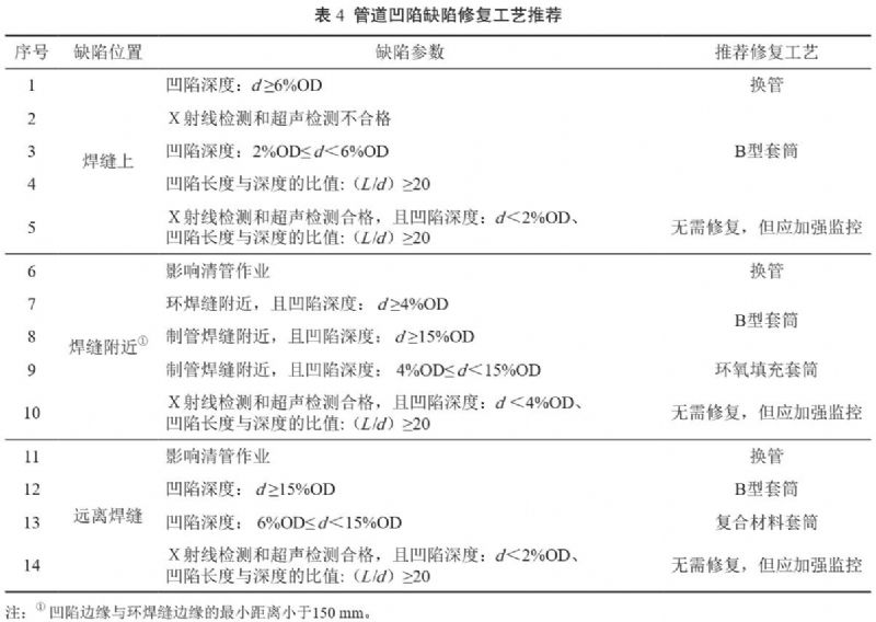 (5)凹陷缺陷修復。凹陷缺陷的穩定性介于制造缺陷和焊縫缺陷之間,首先要通過(guò)開(kāi)挖測量和無(wú)損檢測確定缺陷的位置和相關(guān)參數,根據測量和檢測結果確定修復工藝,凹陷缺陷修復工藝推薦詳見(jiàn)表 4。