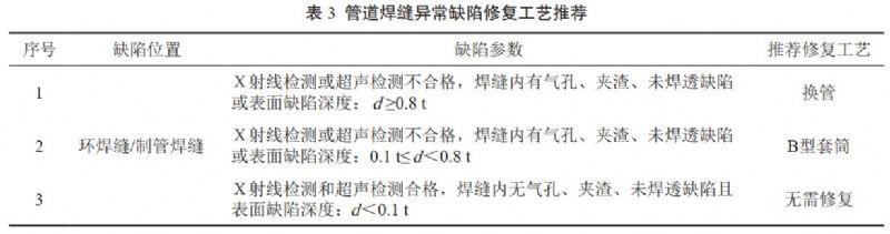 (4)焊縫異常缺陷修復。焊縫缺陷風(fēng)險較大,缺陷修復后的管道安全質(zhì)量是修復工藝比選的重中之重,可選擇換管或B型套袖修復工藝,詳見(jiàn)表 3。