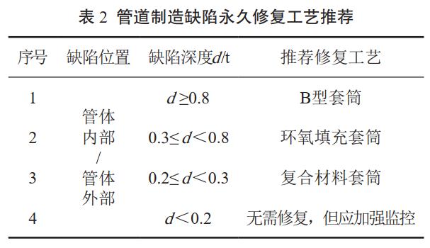 (3)制造缺陷修復。制造缺陷一般都是在制管過(guò)程中產(chǎn)生的,穩定性較強。在保證管道安全質(zhì)量的前提下,優(yōu)先選擇施工成本低、工期短、占地少且對生產(chǎn)和周邊影響都最小的修復工藝。制造缺陷修復工藝推薦詳見(jiàn)表 2。