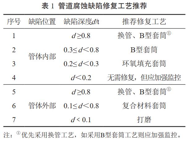 (2)腐蝕缺陷修復。先確定腐蝕缺陷的位置和相關(guān)參數后,再結合高后果區實(shí)際情況進(jìn)行分析和比對。如某管道內部腐蝕缺陷深度大于0.8 t,且處于施工場(chǎng)地狹小的人員密集型高后果區,為保證修復后管道本體質(zhì)量安全并最大限度減少對管道周邊公眾的影響,最佳修復工藝推薦B型套筒,詳見(jiàn)表 1。