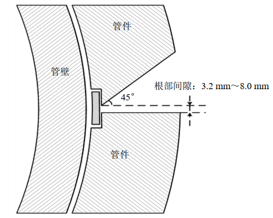 環(huán)焊縫根部的倒角為斜向45°;對610 mm管徑及以下,環(huán)焊縫組對間隙控制在3.2 mm以?xún),?60 mm管徑及以上的,組對間隙最大控制在6.4 mm[3],接頭設計如圖 2所示。
