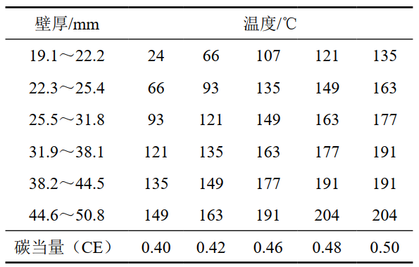 (3) 預熱溫度。阿美標準推薦的橫焊縫預熱溫度[2]如表 1所示,需結合對全包管件壁厚的要求[3]。