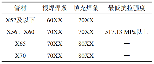(4)焊條選型。阿美標準規定在役焊接一般采用低氫堿性焊條而不用纖維素焊條,不同鋼材等級管道應選擇的焊條最低抗拉強度[2]如表 2所示。
