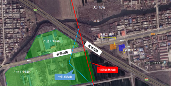 (1)中俄東線(xiàn)(永清—上海)江蘇段在施工設計及外協(xié)征地期間,地方相關(guān)部門(mén)提出管道所處某區域已經(jīng)規劃為工業(yè)園區招商引資,要求管道進(jìn)行避讓。同時(shí)管道路由東側擬規劃建設政府行政服務(wù)中心和加油站。經(jīng)過(guò)多次組織現場(chǎng)踏勘和特定場(chǎng)所復核,確;A數據資料準確無(wú)誤后,從確保本質(zhì)安全和公共安全出發(fā)調整了管道路由設計。如圖 2所示。
