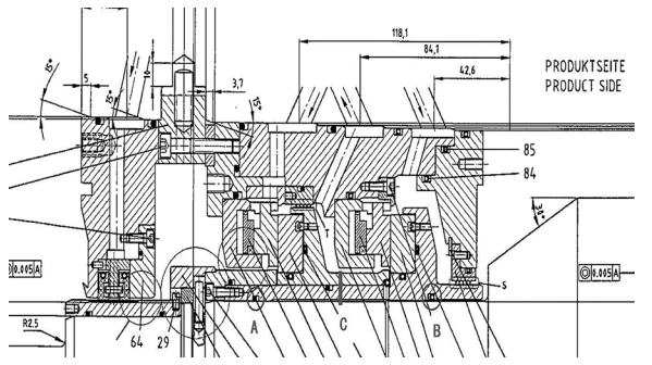 (1)故障描述。某機組運行過(guò)程中,巡檢人員在潤滑油箱內檢出高濃度天然氣,此時(shí)機組控制系統無(wú)任何報警信息。通過(guò)對干氣密封進(jìn)行拆檢,發(fā)現軸套與主軸之間O型圈發(fā)生破損造成密封失效(圖 1 A點(diǎn)),高壓工藝氣沿主軸與軸套之間的間隙竄入潤滑油系統,最終在油箱內產(chǎn)生聚積。