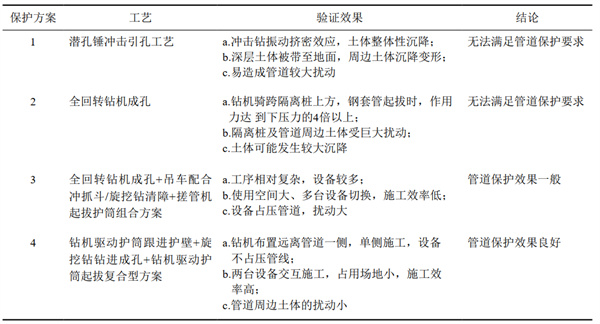 (2)比選驗證管道保護方案。正式施工前,在遠離管道處進(jìn)行試樁試驗,比選隔離樁施工工藝及組合工藝對管道影響程度和實(shí)際防護效果,驗證效果見(jiàn)表 1。經(jīng)過(guò)試驗比選,最終采用方案4,可以最大限度降低對管道周邊土體擾動(dòng),管道保護效果較好,同時(shí)提高了施工工效,縮短了施工周期,見(jiàn)圖 2。