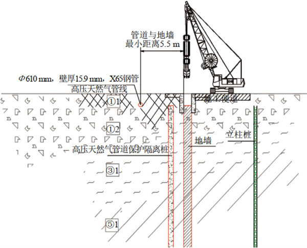 (1)開(kāi)展風(fēng)險評價(jià)和方案論證。公司與屬地管道保護主管部門(mén),項目建設、設計、監理、施工、監測等單位就隧道工程設計方案、專(zhuān)項管道保護方案的可行性進(jìn)行了多輪次討論,先后組織三次專(zhuān)家會(huì )議論證專(zhuān)項安全風(fēng)險評價(jià)報告和管道保護專(zhuān)項方案。最終確定采用隔離樁保護方案,即在在役天然氣管道與通道基坑圍護結構之間增加鉆孔灌注樁,以防范和消減深基坑開(kāi)挖、打樁、重載等造成管線(xiàn)周邊土體的裂隙、滑動(dòng)、塌陷、傾斜等問(wèn)題。同時(shí)為保證管道保護方案的安全實(shí)施,多措并舉對施工作業(yè)活動(dòng)全面精細化管控。