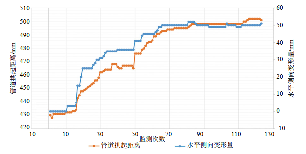 (4)雖然管道應力得到釋放,管道豎向和水平變形并沒(méi)有減小,尤其是當隧道底部土體約束解除之后,在下部疊加彎頭位移作用下,更加劇了管道水平位移。監測顯示,當管輸壓力從7.36 MPa升壓到9.56 MPa過(guò)程中,管段豎向位移拱起501  mm,側向位移增加51 mm,如圖 4所示。