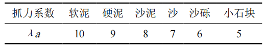 式中:P為錨的系留力,kg;Wa為錨在水中的重量(減掉錨在水中的浮力),kg;λa為錨的抓力系數,其值根據表 1選取。