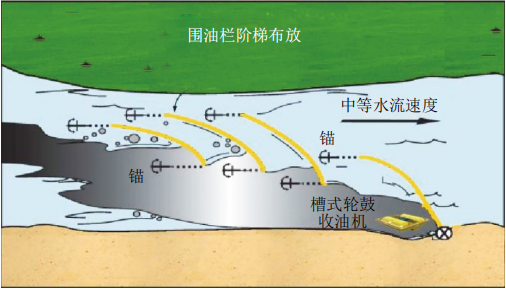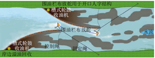 如果溢油表面流速超過(guò)臨界流速,以一定形狀固定的圍油欄就很難發(fā)揮圍控作用。這就需要圍油欄也沿水流方向運動(dòng)。用拖船沿兩邊分別牽引圍油欄的一端,使其在激流中保持穩定運動(dòng),并保持與溢油的相對速度小于圍油欄失效臨界速度,這樣溢油就被完全圍控在圍油欄U形區域內,待轉移到水流平緩之處就可以回收溢油。