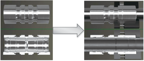 根據金屬力學(xué)特性和金屬塑性變形原理,將連接件主體與管道表面高強度壓合,實(shí)現純機械連接。首先,液壓工具推動(dòng)外套軸向向前擠壓,外套內斜面對連接件主體向內環(huán)形均勻擠壓,造成主體結構塑性變形,外套自防脫結構可以保持主體結構永久不回彈。其次,主體內部密封環(huán)均勻嵌入管體內表面,同時(shí)主體內表面也與管體表面壓接貼合,最終形成耐高壓抗振動(dòng)的高強度純金屬連接(圖 1)。