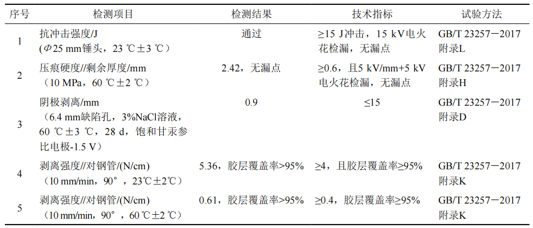 (3)內外防腐層檢測。內防腐層檢測項目及結果見(jiàn)表 3。