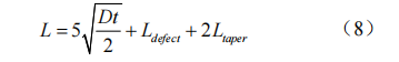 式中L為復材套筒軸向最小寬度,mm;Ldefect為缺陷軸向寬度,mm;Ltaper為復材套筒邊界斜坡寬度,mm;Ltaper為最小值,取5;t為管道壁厚,mm。