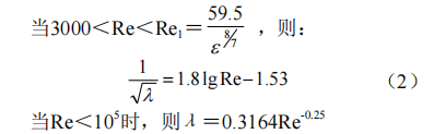 水力摩阻系數λ是雷諾數Re和管壁相對當量粗糙度的函數,隨流態(tài)的不同而不同。對于牛頓流體,流體在管路中的流態(tài)按雷諾數來(lái)劃分,在不同的流態(tài)區,水力摩阻系數與雷諾數及管壁粗糙度的關(guān)系不同,長(cháng)距離原油管道一般運行在紊流態(tài)水力光滑區,常用式(2),這樣就可以根據一個(gè)站間沿程摩阻計算平均結蠟厚度。