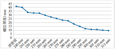 從圖 3可以看出,管道沿線(xiàn)均有蠟的沉積物且分布不均,蠟層厚度在出站20 km~30 km的中間管段達到峰值,最厚為20 mm左右,隨著(zhù)距離的增加,結蠟厚度逐漸變薄。