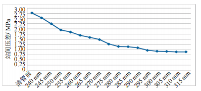 管道清管前站間壓差由投產(chǎn)時(shí)的0.90 MPa增高至2.75 MPa,理論計算結蠟厚度達40 mm,嚴重影響輸送安全和輸送效率。通過(guò)發(fā)送 17次泡沫清管器,降壓效果明顯。作業(yè)過(guò)程中沒(méi)有引起大面積的結蠟脫落,清管期間站間壓差波動(dòng)幅值控制在0.1 MPa以?xún),累計收出結蠟約1300 kg。清管作業(yè)期間管道理論結蠟厚度和壓差變化分別如圖 4和圖 5所示。
