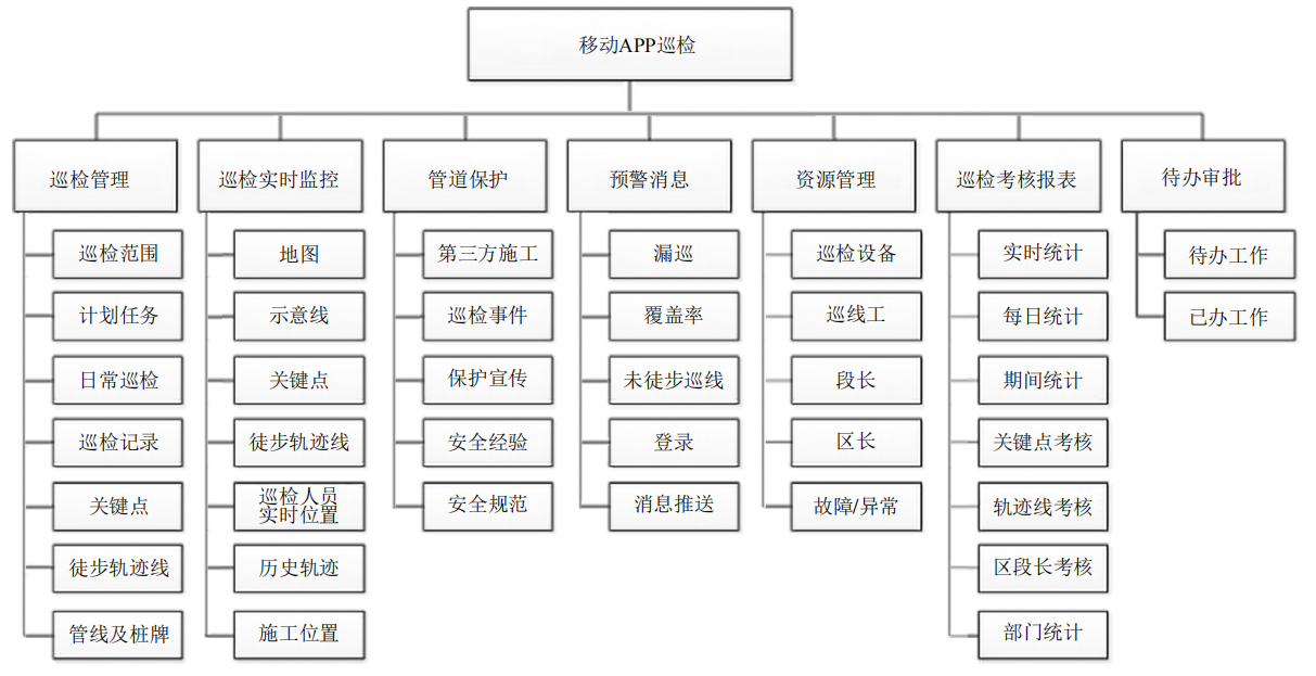 如圖 1所示,移動(dòng)APP巡檢系統包含諸多功能,利用物聯(lián)網(wǎng)技術(shù)可將巡檢異常情況、巡檢事件上報信息等及時(shí)推送給管理人員,使其能夠隨時(shí)隨地了解管道現場(chǎng)及巡檢情況。同時(shí)逐步積累巡檢信息及管道事件數據,為智能管道大數據分析儲備基礎數據[5]。