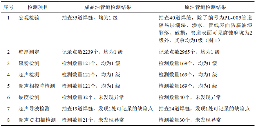 (1)成品油管道和原油管道檢測結果(表 1)。