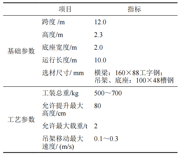 表 1 隧道專(zhuān)用龍門(mén)架基礎參數及工藝參數