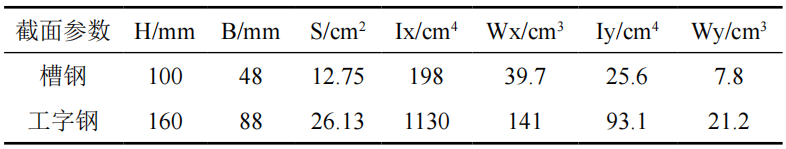 龍門(mén)架主體結構由100 mm×48 mm槽鋼焊接而成,其手拉葫蘆所在橫梁及主體結構下方的導軌采用160 mm×88 mm工字鋼,導軌與固定底座用螺栓連接。根據型鋼尺寸得知龍門(mén)架骨架基本截面參數如表 2所示。其中槽鋼構成龍門(mén)架的主體結構,工字鋼為龍門(mén)架提供移動(dòng)導軌和承重作用。