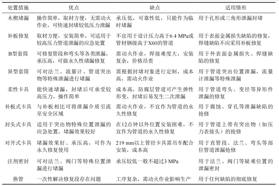 油氣管道泄漏搶修常用木楔、柔性?shī)A具、B型套筒、注劑密封等封堵修復,或采取換管永久修復。表 1比較了各種搶修處置措施的優(yōu)缺點(diǎn)及適用情形。