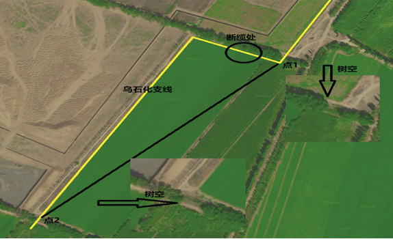 2011年7月,五一農場(chǎng)進(jìn)行滴灌改造時(shí)誤將光纜挖斷。斷纜直接原因是某巡線(xiàn)工誤認為烏石化支線(xiàn)管道走向為點(diǎn)1到點(diǎn)2的直線(xiàn)(圖 5黑線(xiàn)),在沒(méi)有用雷迪儀檢測管道走向和埋深的情況下,自行同意施工方在距點(diǎn)1約20米的位置實(shí)施挖掘機作業(yè),該處正位于管道實(shí)際走向正上方(圖 5黃線(xiàn)),施工時(shí)將光纜挖斷。間接原因是風(fēng)險辨識不到位,沒(méi)按要求及時(shí)上報第三方施工信息;經(jīng)現場(chǎng)勘查點(diǎn)1和點(diǎn)2各有一處8~10米的樹(shù)空隙,僅點(diǎn)1、點(diǎn)2有標志樁和轉角樁,中間管段沒(méi)有設置標識牌,管道走向和位置不清晰。