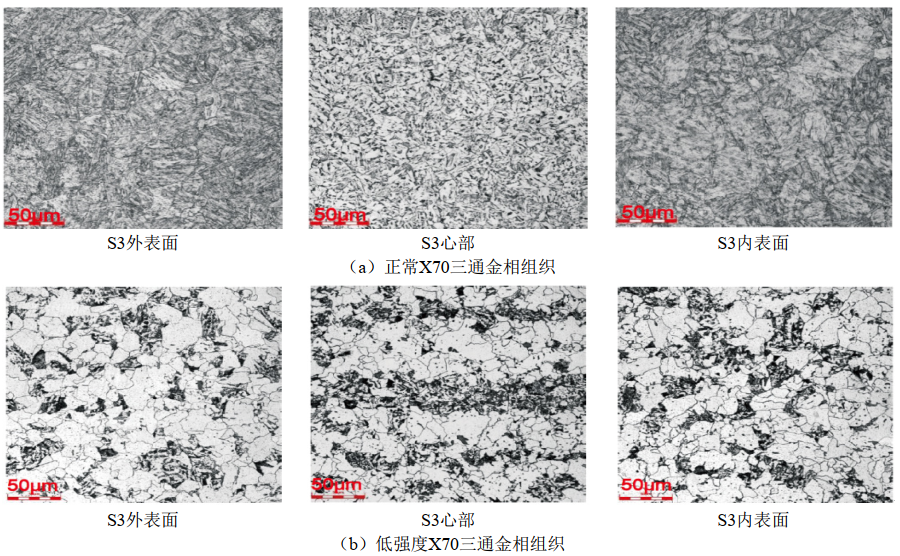 采用PTI-5500金相檢測儀對現場(chǎng)低強度X70三通S3位置進(jìn)行外表面、心部和內表面金相檢測,檢測標準執行GB/T 13298―2015《金屬顯微組織檢驗方法》。圖 2(a)為正常X70三通金相組織,其內外表面為貝氏體,心部為貝氏體+鐵素體+少量珠光體。圖 2(b)為低強度X70三通金相組織,其內外表面和心部金相均以鐵素體為主,且含量大于50%,含有少量貝氏體和珠光體。因此,現場(chǎng)表面金相組織以鐵素體為主且含量大于50%可作為低強度三通判斷依據之一。