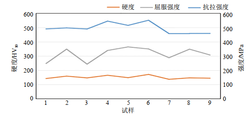 圖 3 低強度X70三通表面硬度與屈服強度和抗拉強度關(guān)系