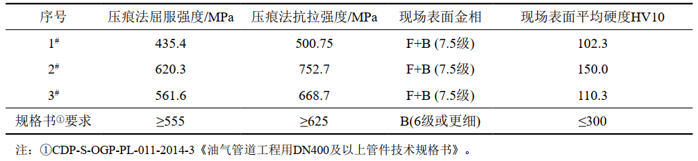 (1)針對高鋼級低強度三通在線(xiàn)檢測和排查難題,提出了采用表面金相、表面硬度和壓痕法組合排查方案。以表面金相鐵素體為主且表面硬度低于170 HV10初步判定,以壓痕法檢測結果最終判定在役三通是否為低強度異常三通。