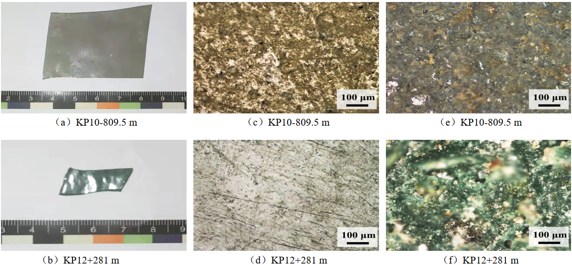 由表 2數據可知,兩處防腐層厚度均滿(mǎn)足GB/T 51241對厚度要求(≥1.0 mm)。如前所述,盡管KP10-809.5 m存在大面積鼓泡、積液現象,電火花檢漏卻無(wú)漏點(diǎn)檢出。這表明土壤中的水并非通過(guò)防腐層表面宏觀(guān)破損進(jìn)入內部,防腐層內部可能存在微觀(guān)缺陷,為水分穿過(guò)防腐層向管道本體滲透提供了通道。