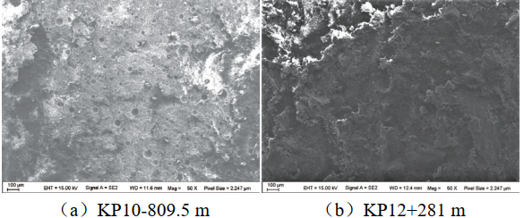 由圖 3可知,兩處管道補口聚氨酯防腐層下方管道表面均未觀(guān)察到呈散點(diǎn)分布的坑穴狀腐蝕,其中,KP10-809.5 m表面較為粗糙,可能發(fā)生了一定程度的均勻腐蝕,而KP12+281 m表面相對光滑,目測其腐蝕程度較輕。