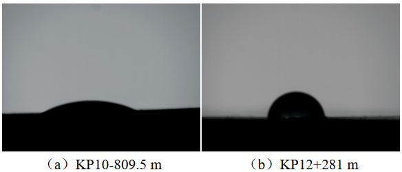 防腐層樣品外表面接觸角測試結果見(jiàn)圖 6。KP10-809.5 m處防腐層外表面對水的接觸角僅為23°,明顯低于KP12+281 m處防腐層(71°)。表明KP10-809.5 m處聚氨酯防腐層的防水性能較差。