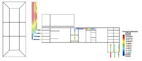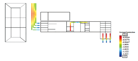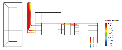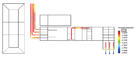 近陽(yáng)極地床最終優(yōu)化方案如圖 4所示,需要陽(yáng)極地床4組,每組3支,長(cháng)1 m,埋深1 m,距離管道1 m,總輸出電流2.4 A,所有管道都在陰極保護準則要求的范圍內,達到良好的保護效果。說(shuō)明通過(guò)近陽(yáng)極地床的優(yōu)化分布,可以實(shí)現站場(chǎng)埋地管網(wǎng)各處達到理想的保護效果。