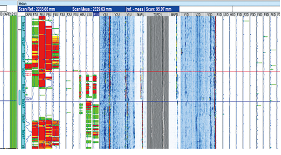 (5)如果反射信號出現在閘門(mén)位中間,可能是坡口未熔合,通常信號連續、波幅較大、有一定長(cháng)度。如果鈍邊通道也能觀(guān)察到相關(guān)信號顯示,則可能是根部斷弧、根部未熔合、根部裂紋、錯邊等等。如圖 4紅藍線(xiàn)之間,從帶狀圖閘門(mén)位置和根部體積通道很明顯看出這是一個(gè)根部未熔合缺陷。