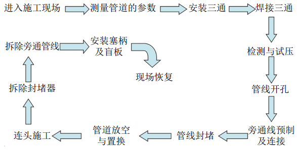 在役管道不停輸狀態(tài)下的施工通常采用封堵技術(shù)與設備,先將改造段兩端分別用旁通管線(xiàn)接通輸送介質(zhì),然后封堵主管線(xiàn),清空隔離段介質(zhì),以進(jìn)行主管線(xiàn)施工作業(yè)。待新管段恢復后,解除封堵,切換至新管段正常輸送,最后將旁通管線(xiàn)拆除,F場(chǎng)管件機械密封、恢復。其施工工藝及施工流程分別如圖 1、圖 2所示。不停輸施工主要執行標準GB/T 28055―2011《鋼制管道帶壓封堵技術(shù)規范》、GB/T 31032―2014《鋼制管道焊接及驗收》、SY/T 6150―2017《鋼制管道封堵技術(shù)規范 第1部分 塞式、筒式封堵》等。
