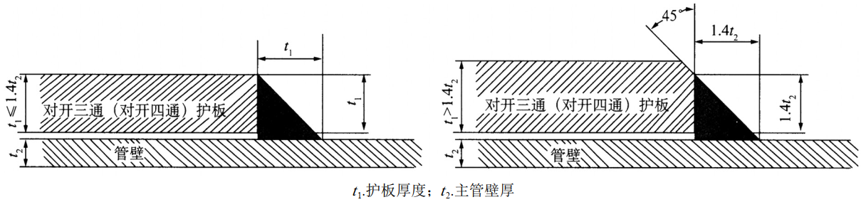 (1)三通焊接。嚴格按照GB/T 28055―2011要求定位三通安裝間距,測量三通環(huán)焊縫位置的管道實(shí)際壁厚,結合標準給出的許焊壓力計算公式再次計算確認焊接位置。焊接前必須進(jìn)行焊接工藝交底,焊接過(guò)程嚴格執行焊接工藝規程,落實(shí)預熱、多排多道、單層焊接厚度、回火/退火焊道等要求,保證焊接質(zhì)量,預防焊接裂紋,減少應力集中。直焊縫焊接應加墊鐵以保護管道不與電弧直接接觸;兩端加引護板并在焊接完成后切除,避免在三通本體上引弧和收弧,有利于減少缺陷產(chǎn)生。環(huán)焊縫焊接時(shí)嚴格按照SY/T 6150―2017和焊接工藝要求控制角焊縫的焊角尺寸(圖 4),既要保證焊縫強度,同時(shí)還要盡量降低焊縫位置的應力集中。