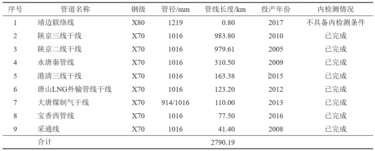 北京管道公司自2017年8月開(kāi)始對所轄陜京三線(xiàn)、永唐秦管線(xiàn)、唐山LNG外輸管線(xiàn)、大唐煤制氣干線(xiàn)、港清三線(xiàn)、寶香西管線(xiàn)、采通線(xiàn)、靖邊聯(lián)絡(luò )線(xiàn)、陜京二線(xiàn)9條管線(xiàn)共計2790多公里管道(表 1)、24.4萬(wàn)多道焊口進(jìn)行環(huán)焊縫質(zhì)量風(fēng)險排查。通過(guò)選擇性開(kāi)挖驗證,無(wú)損檢測再次檢驗,經(jīng)風(fēng)險評價(jià)對有缺陷的環(huán)焊縫采取補強或換管處理,降低管道安全隱患,為管道安全平穩運行打下堅實(shí)基礎。