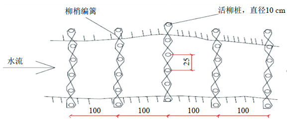 (4)在消能池下游2 m處設置5排柳谷坊(圖 4),谷坊結構形式由相鄰樁排加回填土組成。樁排由柳梢上編籬構成。樁排橫向長(cháng)約6 m,兩端插入溝坡不小于0.5 m。樁排間采用生態(tài)袋碼砌,整體與原地貌平緩過(guò)渡。