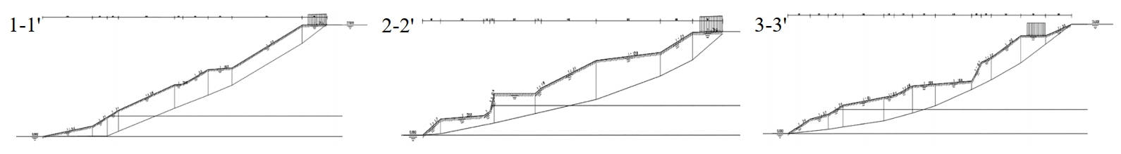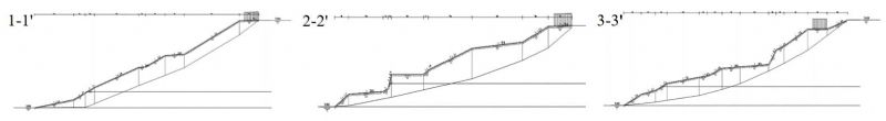 采用DZ/T 0218―2006《滑坡防治工程勘查規范》推薦的畢肖普條分法,根據滑坡地形地貌條件,對滑坡體各個(gè)潛在滑動(dòng)面分別進(jìn)行了穩定性分析計算;抡w選取1-1'、2-2'、3-3'三條剖面可能存在的潛在滑面進(jìn)行了穩定性計算。
