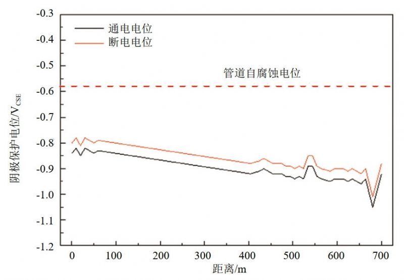 對事故點(diǎn)西側殘留管段以西700 m范圍內管地通電電位、斷電電位進(jìn)行測量,測試間距為10 m。測量結果表明該管段通電電位﹣0.83 VCSE~ ﹣1.05 VCSE,斷電電位﹣0.78 VCSE~﹣1.01 VCSE,如圖 4所示。此外,現場(chǎng)檢測該區域內未施加陰保管道及試片的自然電位為﹣0.48 VCSE~﹣0.63 VCSE。