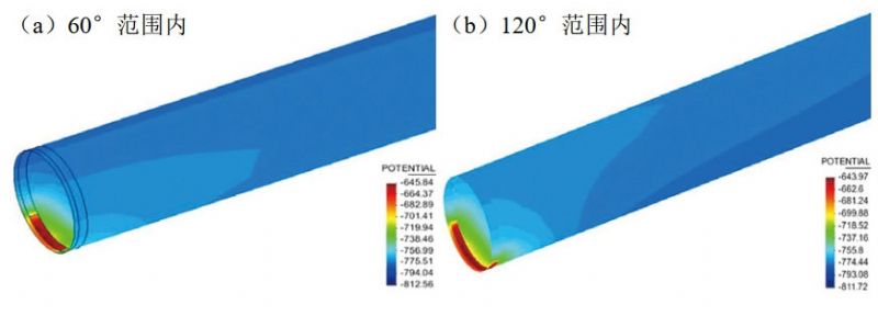 當防腐層破損處位于墻體內側30 mm~90 mm,分別處于管道下方60°和120°時(shí)管道外表面電位分布如圖 6所示。