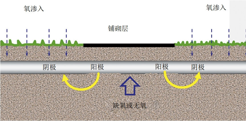 三是氧濃差電池導致管道距離墻體表面1 m之內腐蝕嚴重。管體穿越墻體界面靠近排污暗渠側氧含量較高,靠近墻體側氧含量較低,會(huì )在局部形成氧濃差腐蝕電池,加速缺氧位置處的腐蝕,從而導致墻體內側1 m范圍內局部腐蝕嚴重。這個(gè)類(lèi)似于穿越路面的管道由于氧濃差電池導致管道腐蝕,如圖 8所示。