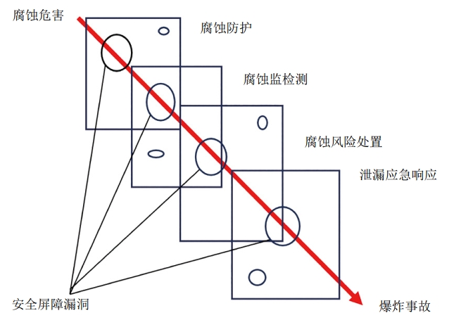 如圖 1所示,奶酪片表示安全屏障,奶酪片上的小孔表示安全屏障的漏洞,一旦所有安全屏障的漏洞都被突破,則會(huì )造成事故。青島“11·22”輸油管道爆炸事故的直接原因是管道腐蝕。事故管段與排水暗渠交叉,所處區域土壤鹽堿和地下水氯化物含量高,同時(shí)排水暗渠內隨著(zhù)潮汐變化海水倒灌,使管道長(cháng)期處于干濕交替的海水及鹽霧腐蝕環(huán)境,加之管道受到道路承重和振動(dòng)等因素影響,導致管道腐蝕加劇。在腐蝕危害與爆炸事故之間,管道運營(yíng)單位實(shí)際上有四層安全屏障可以避免事故的發(fā)生。