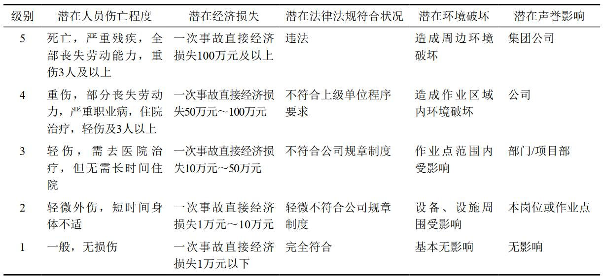 表 1 HSE隱患/不符合潛在嚴重性級別劃分表