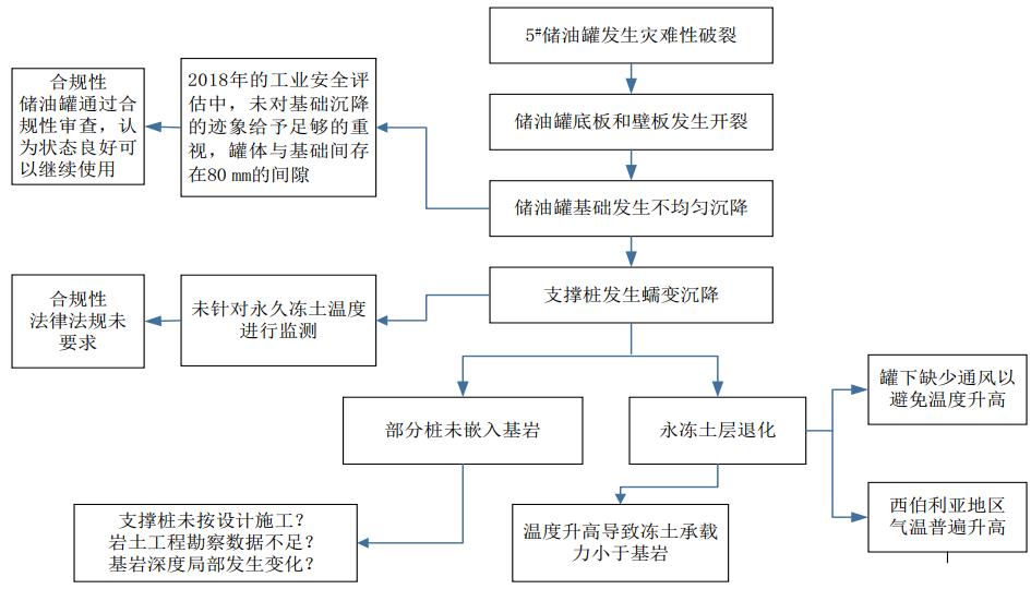 俄羅斯聯(lián)邦環(huán)境、工業(yè)和核監管局開(kāi)展了事故調查,同時(shí)涉事企業(yè)委托伊爾姆環(huán)境資源管理咨詢(xún)公司(Environmental Resources Management,ERM)開(kāi)展了獨立事故原因分析。調查顯示,儲油罐發(fā)生破裂是由多種因素共同作用的結果,直接原因是受氣候變暖等因素的影響,凍土退化造成儲油罐混凝土支撐樁性能劣化受損,儲油罐基礎發(fā)生不均勻沉降,導致罐底與罐壁開(kāi)裂(圖 2)。儲油罐事故原因分析如圖 3所示。