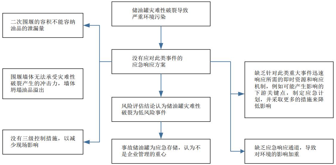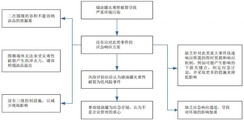 (3)應急處置工作不到位;诤弦幮运季S而不是基于對風(fēng)險的理解開(kāi)展安全管理,儲油罐發(fā)生開(kāi)裂失效風(fēng)險的可能性和嚴重性被低估。以往風(fēng)險評估認為災難性破裂事故發(fā)生概率很低(1.5×10-5),后果也很。▋H考慮了對土壤的影響),失效情況不太嚴重,風(fēng)險評估報告也未對此提出建議措施。應對重大泄漏事件的措施和經(jīng)驗不足,缺乏對此類(lèi)重大事件迅速響應所需的資源和響應程序,未進(jìn)行詳細的溢油模擬以制定溢油反應計劃(OSRP)。OSRP對受影響區域的估計甚至比風(fēng)險評估中計算的區域還要小。儲油罐圍堰容積不足以容納泄漏的油品,圍堰墻體未能承受住泄漏油品的動(dòng)態(tài)沖擊發(fā)生坍塌,油品溢出圍堰。對溢油可能的流向估計不足,未制定和實(shí)施有效的溢油應急預案。風(fēng)險消減措施也僅限于清除污染土壤和從圍堰內回收油品。如圖 5所示。