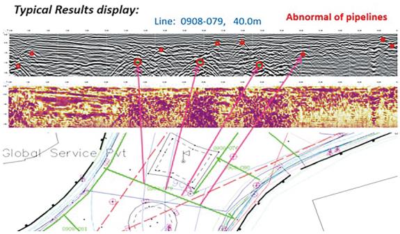 探地雷達設備價(jià)格昂貴,對實(shí)施探測的場(chǎng)地有較高要求,探測準備工作比較繁瑣。探測效果與管道徑深比、地質(zhì)條件密接相關(guān),管徑越大、埋深越淺則探測效果越明顯,富水地區探測非金屬管道效果不理想,復雜環(huán)境下難以分辨和確認目標管道。探測結果解譯過(guò)程繁瑣,物探工程師需要較多的內外業(yè)經(jīng)驗。實(shí)際工作中一般用于輔助管線(xiàn)探測,以及驗證判斷是金屬管道還是非金屬管道。